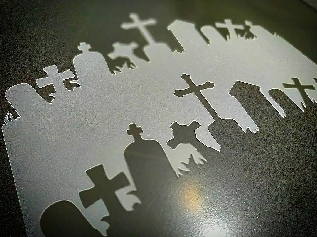 O Stencil Cemitério / Zumbi para aerografias tem o formato folha A4 com medidas de 21 × 30 cm e o desenho tem as seguintes medidas: