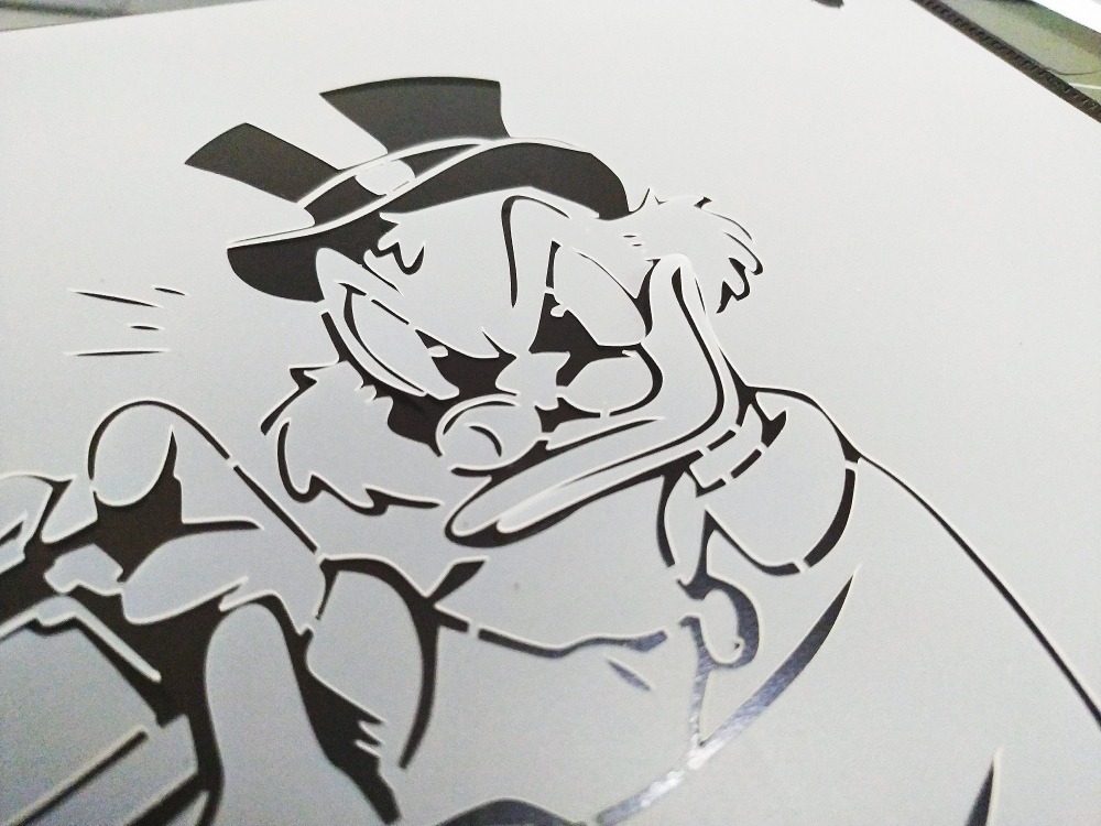 O STENCIL TIO PATINHAS tem o formato folha A4 com medidas de 21 × 30 cm e o desenho do Tio Patinhas tem as seguintes medidas:
